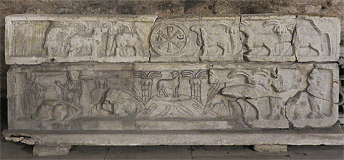 | ↑「羊と鹿の石棺」(Sarcophage des brebis et des cerfs) | ↑「キリスト復活(アナスタシス)の石棺断片」 (Fragment du sarcophage de l'Anastasis) |